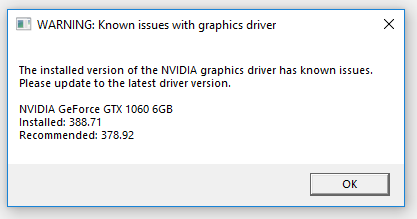 Warning Known Issues With Graphics Driver The Installed Version Of The Nvidia Graphics Driver Has Known Issues Please Update To The Latest Driver Version Nvidia Geforce Gtx 1060 6gb Installed 381 Recommended